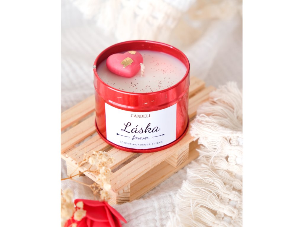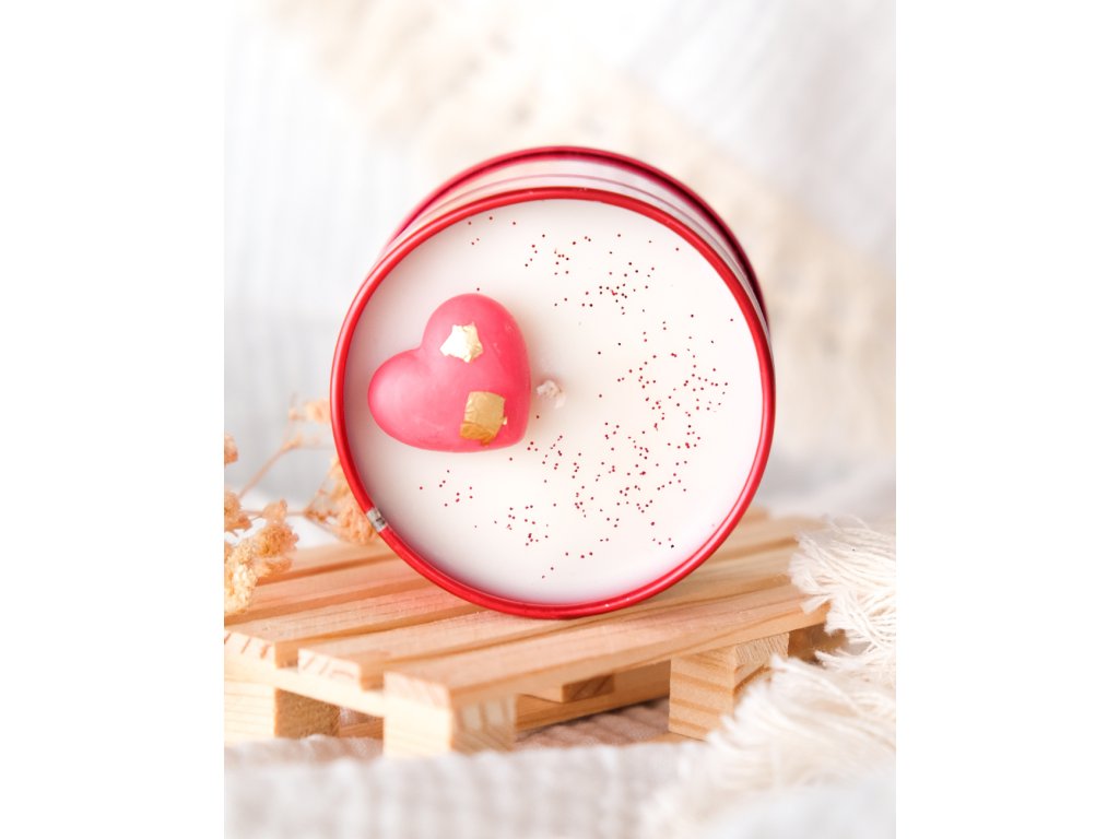 Ručně odlitá svíčka ze sójového a kokosového vosku z valentýnské kolekce. Uvnitř se ukrývá červené srdíčko se zlatým zdobením, doplněné jemnými červenými třpytkami✨