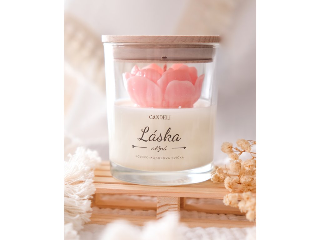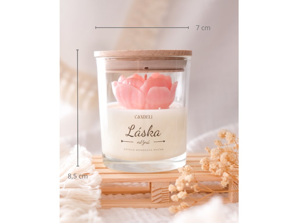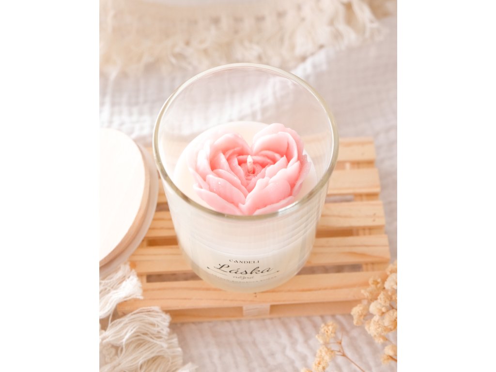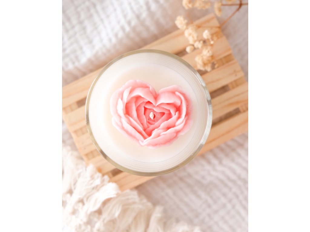 Ručně odlitá svíčka ze sójového a kokosového vosku z valentýnské kolekce. Uvnitř se ukrývá růžové květinové srdce, jehož květ ve tvaru srdce je jemně posypaný minerálními třpytkami ✨