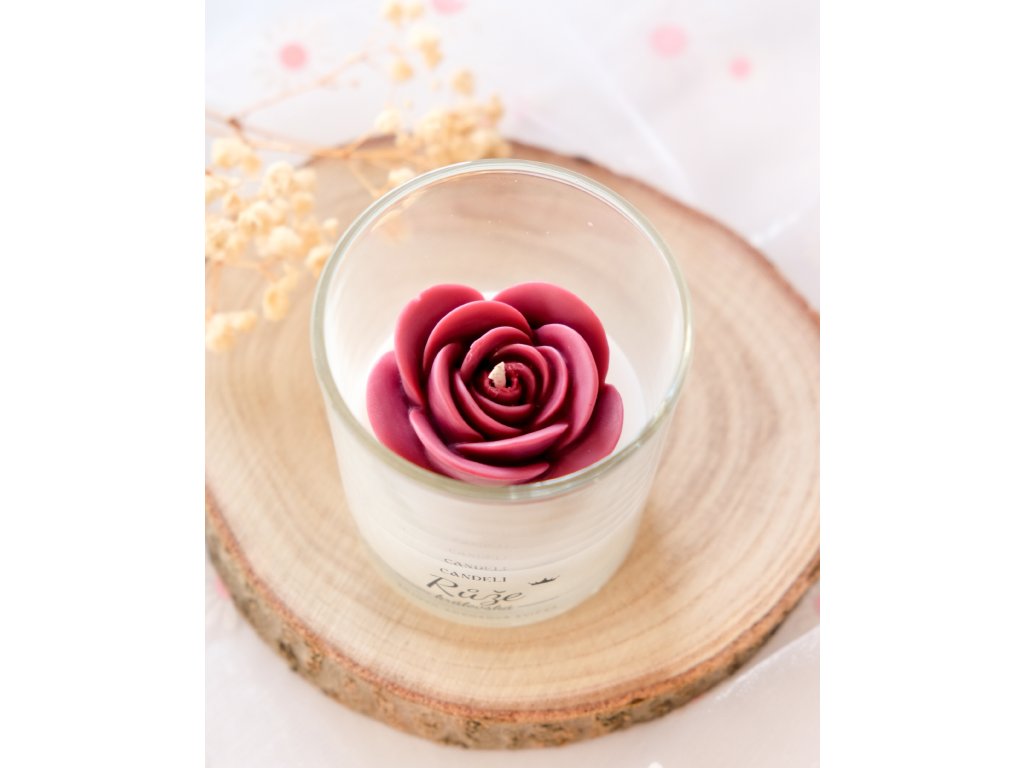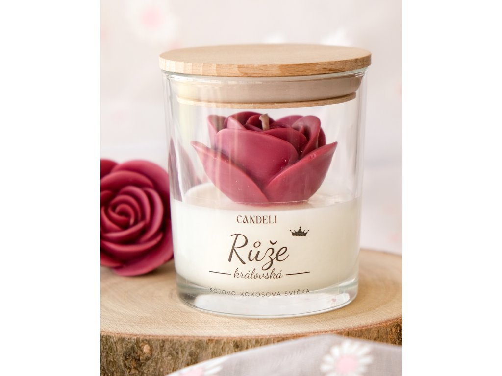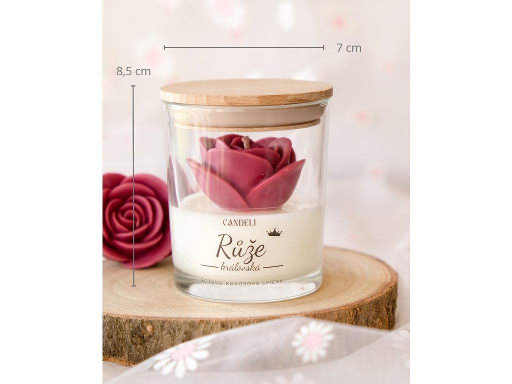 Ručně odlitá svíčka ze sójového a kokosového vosku, uvnitř které se vyjímá růže v barvě bordó – symbol královské krásy, hloubky a vášně. Vůně propojuje klasickou eleganci růže s ovocnou svěžestí rybízu a hřejivým podtónem santalového dřeva.