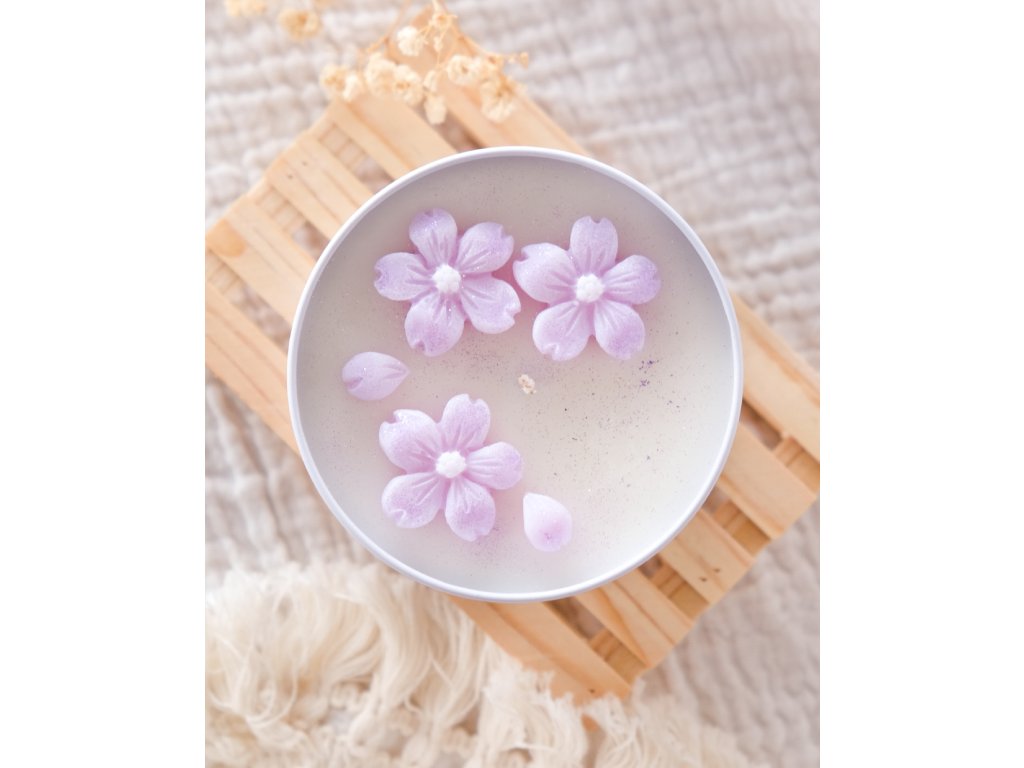 Uvnitř jsou drobné fialové květinky a celá svíčka je jemně poprášená minerálními třpytkami, které jsou biologicky odbouratelné a šetrné k přírodě.