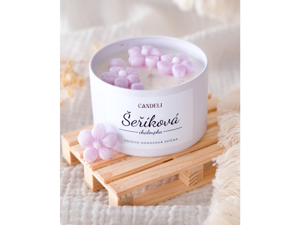 Ručně odlitá svíčka ze sójového a kokosového vosku, inspirovaná pohádkou Perníková chaloupka, jen místo perníku voní šeříkem.