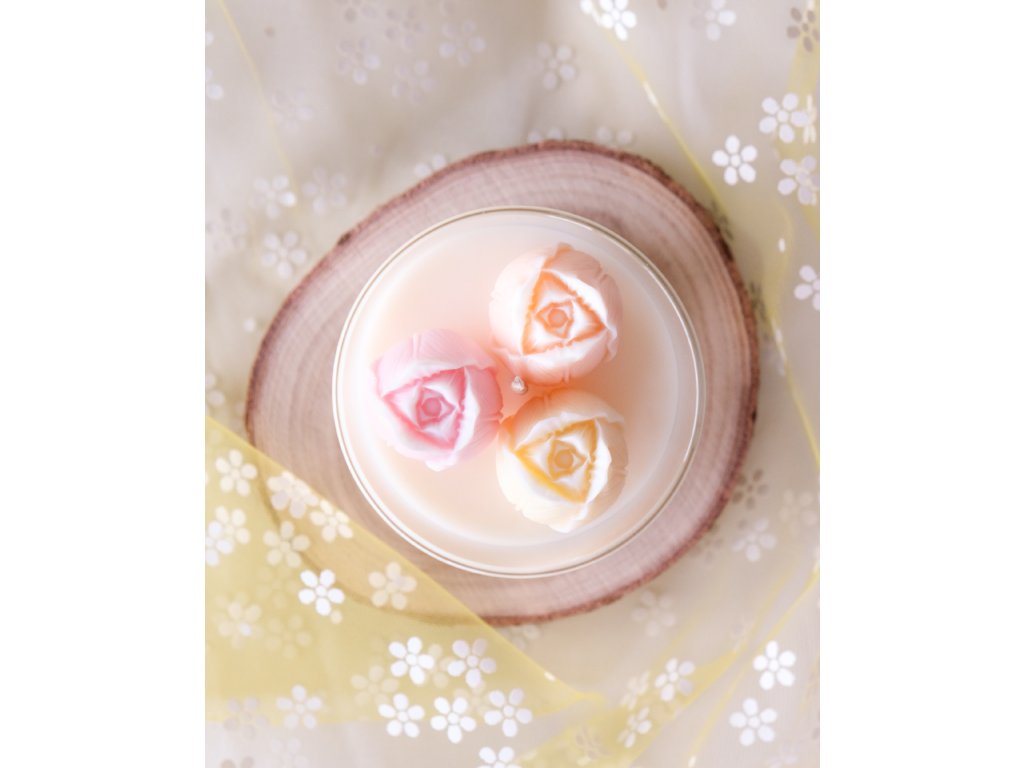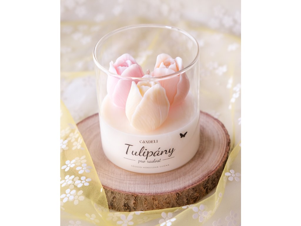 Ručně odlitá svíčka ze sójového a kokosového vosku, uvnitř které rozkvétají tři tulipány v růžové, oranžové a žluté barvě. Vůně propojuje šťavnaté maliny a hrozny s jemným květinovým nádechem, dotekem brusinek a sladkou tečkou šlehané vanilky.